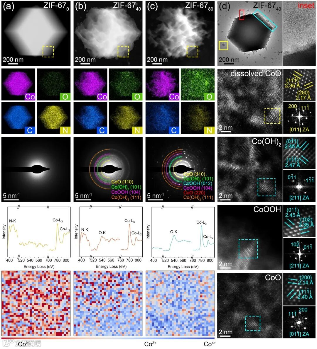 结合元素分布图谱、选区电子衍射及EELS价态分析,共同构建了ZIF-67原子级结构演变的完整证据。