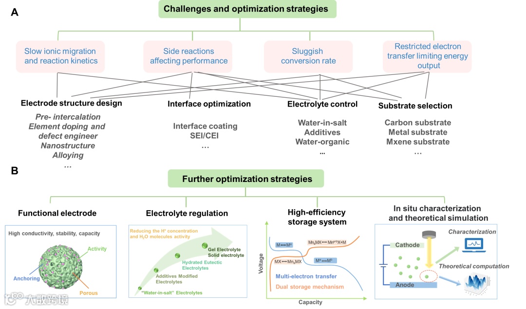 从资源与性能基础来看,锰元素的地壳储量远超锂、锌等主流电池金属,且价格低廉,为 AMIBs 的规模化应用奠定了成本优势;从电化学性能而言,基于 Mn/Mn2+ 的 AMIBs 展现出突出的理论容量(质量比容量 976 mAh g-1、体积比容量 7250 mAh cm-3),远超锌离子电池,且 Mn2+具有适宜的氧化还原电位(-1.19 V vs 标准氢电极 SHE),能匹配多种正极材料构建高电压体系。然而,AMIBs 的发展仍受限于锰化学特性与水系环境的复杂耦合问题,从电极到界面的多维度挑战亟待突破。因此,深入揭示 Mn2+独特化学属性(如多价态、强配位能力)与水系环境耦合下的失效机制,针对性地从正极材料设计、负极界面调控、电解液体系优化三个维度提出协同解决方案,成为突破 AMIBs 性能瓶颈、推动其从实验室走向工业化应用的关键所在。