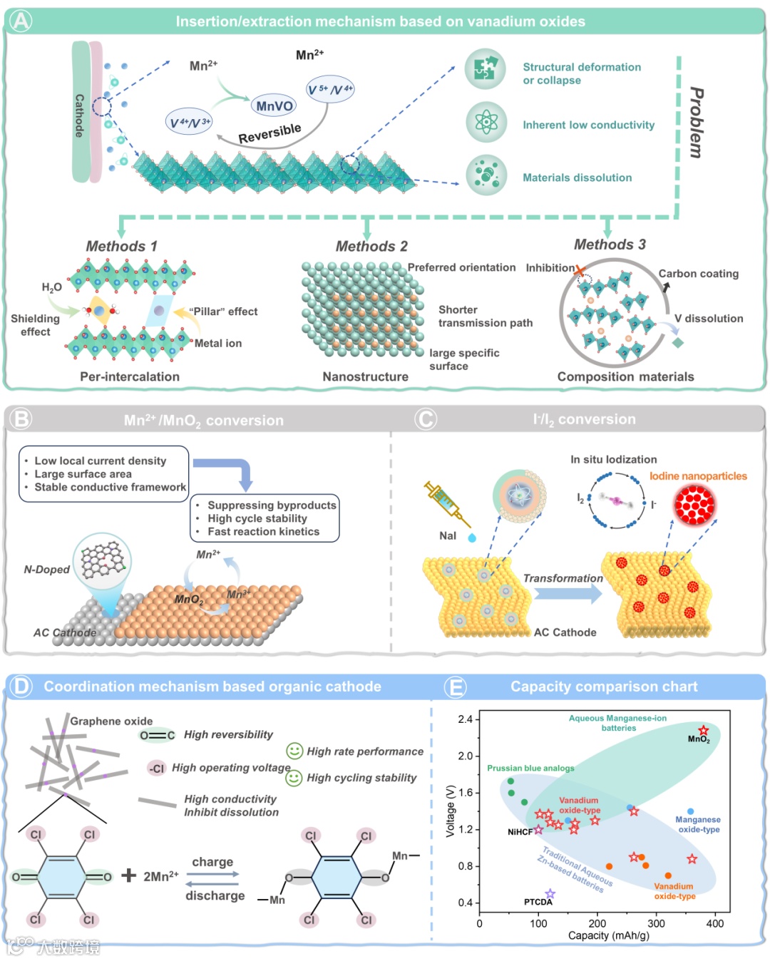 图5. AMIBs正极设计策略。(A)锰离子在钒氧化物中的嵌入及稳定性设计。(B)二氧化锰的转化机制及集流体优化。(C)水系锰离子电池中碘/碘离子的氧化还原过程。(D)4-氯苯醌阴极中锰离子的配位化学(E)水系锰离子和锌离子电池系统中各种阴极材料的放电容量和工作电压