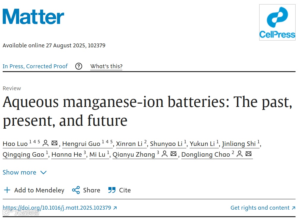 近日厦门理工罗浩副教授联合复旦大学晁栋梁教授及四川大学张千玉教授在Matter上发表了题为《Aqueous Manganese-Ion Batteries: The Past, Present, and Future》的综述论文。系统梳理 Mn2+化学、结构设计与性能机制的研究,围绕 Mn2+高电荷密度与强水合作用的核心特性,深入剖析了 AMIBs 从正负极材料到电解液体系的关键科学问题与优化方向,旨在填补基础材料研究与产业化应用的鸿沟,加速水系电池规模化商用。在电极材料层面,综述针对正极与 Mn2+存储的适配难题,系统分析嵌入型、转化型、配位型三类核心材料的优化策略,通过结构改性、性能调控等手段,多维度提升 Mn2+存储动力学与循环稳定性;针对负极 Mn 沉积 / 溶解可逆性差的瓶颈,总结界面涂层、合金化设计、集流体改性及 “摇椅式” 非沉积机制等解决方案,有效抑制析氢反应、枝晶生长与 “死锰” 形成,提升负极性能。电解液层面,从优化 Mn2+溶剂化结构、引入功能添加剂、开发混合与凝胶电解液等多维度提出调控策略,平衡离子电导率、界面稳定性与环境适应性,为高安全长寿命 AMIBs 提供设计范式。最后,作者展望了未来AMIBs的设计方向与商业化前景,指出AMIBs 凭借资源、安全、能量密度优势,有望在多领域发挥重要作用,成为支撑全球能源转型的绿色可持续储能技术。