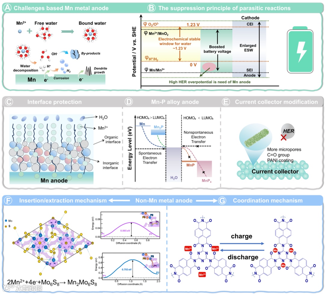 图6. AMIBs中金属锰负极与非金属负极的设计策略。(A)锰离子溶剂化结构的示意图及锰金属阳极所面临的挑战(B)水性电解质的电化学窗口与全锰电池中锰Mn2+/Mn的氧化还原电位之间的比较(C)使用有机-无机杂化涂层对锰金属进行界面保护。(D)锰及其合金的能级位移。(E)利用缺陷工程和聚苯胺(PANI)涂层进行的集流体改性。(F)锰离子迁移路径(左)和扩散能垒(右)。(G)氧化还原循环过程中Mn2+在PI-COF中的多齿螯合示意图