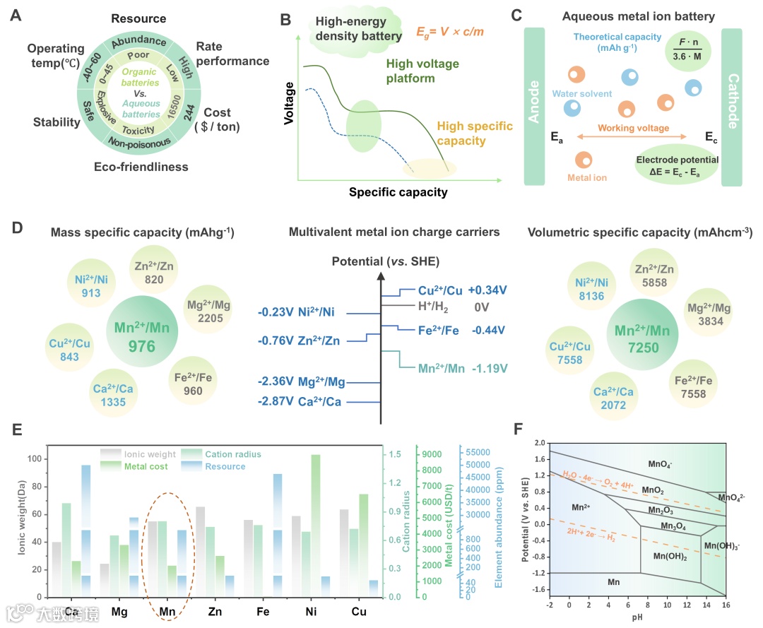 图1. AMIBs研究基础与体系优势。(A)水系电解质与有机电解质的特性比较。(B和C)能量密度和容量的热力学估算。(D)二价金属离子体系的电化学参数比较。(E)阳离子半径、重量、成本和天然丰度的评估。(F)锰的Pourbaix图:水环境中氧化还原稳定性。