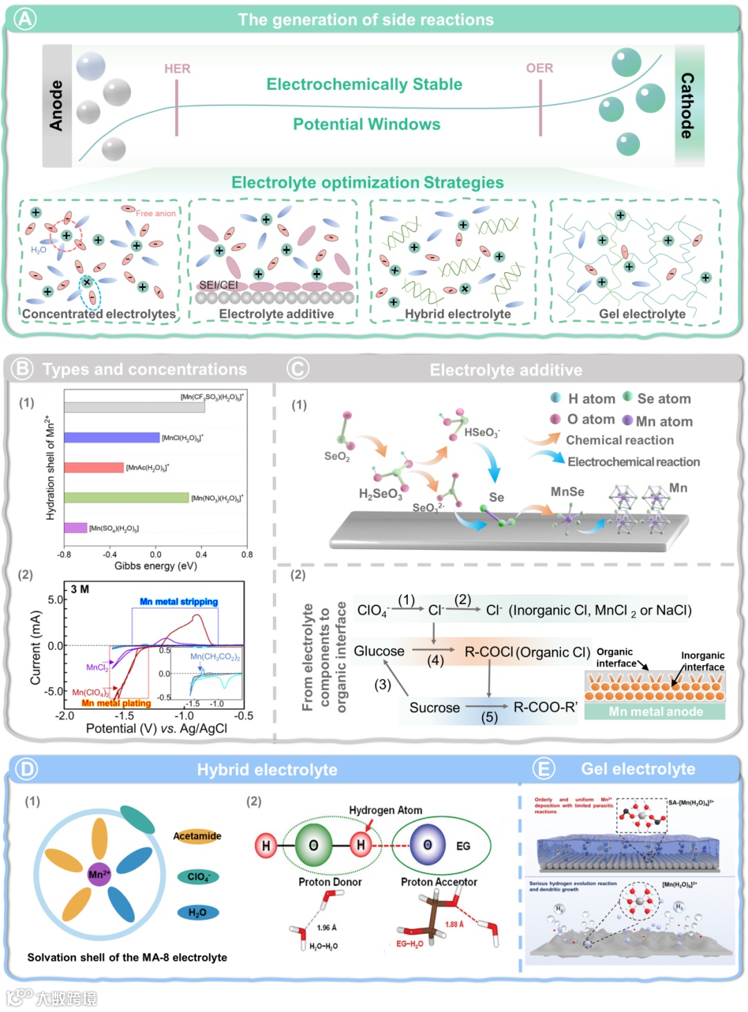 图7. AMIBs电解液改性策略。(A)电解质中的气体生成现象及减缓策略。(B)(1)不同配位阴离子对 Mn2+的溶剂化结构及其形成能。(2)基于不同配位阴离子的 3M 水溶液电解质中的锰金属沉积/剥离电位。(C)(1)SeO2作为添加剂的MnSO4电解液中的锰沉积行为(2)有机界面层的形成机制。(D)(1)水分子与乙二醇(EG)之间的氢键形成以及键长比较。(2)在1:8摩尔比(MA-8)的Mn2+ -乙酰胺系统中的溶剂化结构(E)离子交联凝胶电解质(SA@Mn)与传统液体电解质的电极-电解质界面比较。