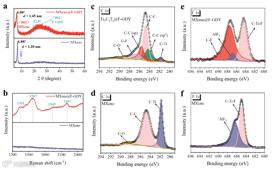 图3. MXene@F-GDY异质结构与纯MXene的(a) XRD与(b) 拉曼谱图,(c-f) MXene@F-GDY异质结构与纯MXene的XPS谱图。