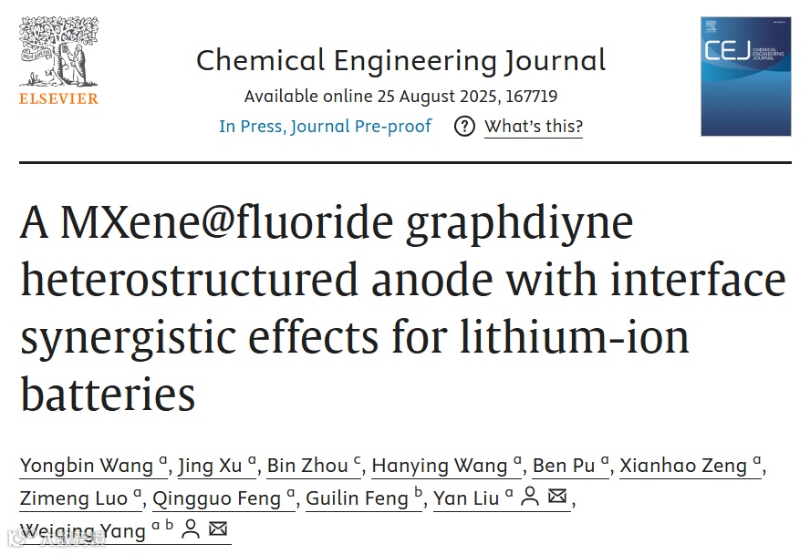 近日,西南交通大学的杨维清教授与刘妍副教授,在国际知名期刊Chemical Engineering Journal上发表题为“A MXene@fluoride graphdiyne heterostructured anode with interface synergistic effects for lithium-ion batteries”的研究论文。该研究通过原位界面生长策略,成功构筑了MXene@氟化石墨炔(MXene@F-GDY)二维异质结构。研究团队将F-GDY纳米片精准集成于MXene纳米片的表面与层间空间中,有效抑制了MXene的再堆叠,并诱导产生显著的层间距扩张,从而构建出宽度更大、稳定性更高的锂离子传输通道。尤为重要的是,MXene与F-GDY之间因功函数差异诱发界面电子转移,形成强内建电场,极大提升了电荷转移效率。此外,F-GDY本征面内纳米孔结构(d = 13.3 Å)提供了大量可及的锂离子存储位点,同时显著降低了离子迁移动力学阻力。得益于此独特的结构设计与界面协同机制,MXene@F-GDY电极表现出卓越的电化学性能,包括高比容量、优异倍率性能以及出色的长循环稳定性。该研究为二维异质结构在高性能锂离子电池中的应用提供了新思路与实验依据。