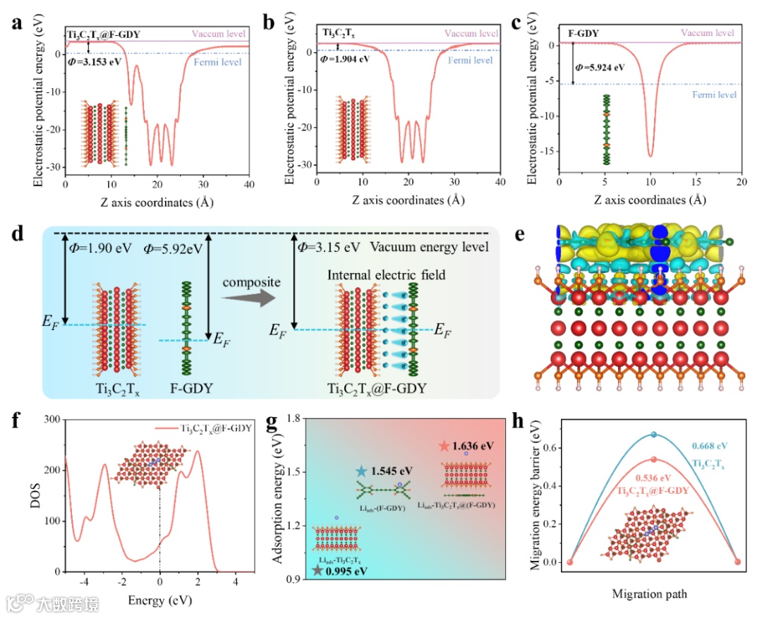 图4. (a-c) MXene@F-GDY,纯MXene,纯F-GDY的功函;(d)电子转移和内建电场形成示意图;(e)异质结构界面处的电荷密度差;(f)MXene@F-GDY的DOS图;(g)锂离子吸附能;(h)锂离子在表面的迁移势垒。