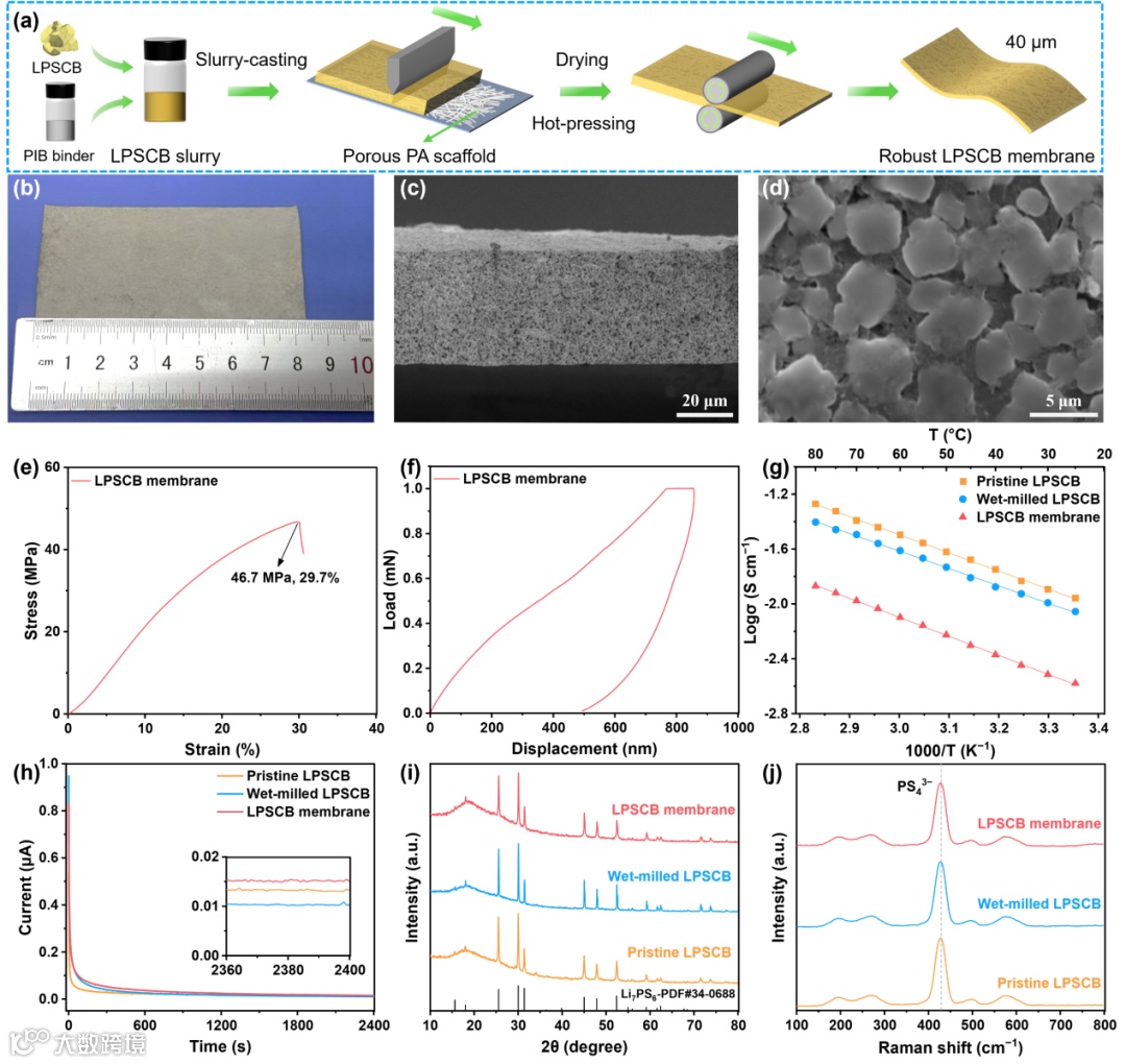 制备超薄、高离子传导且机械强韧的电解质膜是确保硫化物基ASSLMBs稳定安全运行的关键。LPSCB电解质通过高速球磨结合退火工艺合成。原始LPSCB粉末因颗粒尺寸不均需经湿法球磨细化处理,处理后粉末平均粒径降至1.92 μm。采用聚异丁烯(PIB)粘合剂与多孔聚酰胺(PA)骨架的协同策略,通过浆料浇筑-干燥-热压工艺成功制备厚度为40 μm的LPSCB膜。截面和表面SEM图显示,薄膜具有独特的立方体结构,孔隙率极低且无微裂纹。力学性能测试表明,LPSCB膜展现出46.7 MPa的拉伸强度和24.3 GPa的杨氏模量,能有效适应电池循环体积变化并抑制锂枝晶渗透。电荷传输性能测试显示,LPSCB膜在30℃下的离子电导率达3.05 mS cm−1,电子电导率低至1.92×10−10 S cm−1。XRD图与Raman光谱共同证实湿法浆料处理过程未破坏LPSCB晶体结构,膜内粉体保持结构完整性。