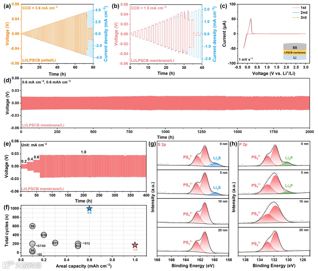 硫化物电解质膜与锂金属负极的界面兼容性是决定ASSLMBs性能的核心因素。LPSCB膜凭借低表面孔隙率、高拉伸强度和高杨氏模量展现出优异的锂枝晶抑制能力。锂对称电池临界电流密度(CCD)测试显示,LPSCB片的CCD达3.6 mA cm−2,LPSCB薄膜的CCD达1.5 mA cm−2。在0.6 mA cm−2电流密度下,Li/LPSCB膜/Li对称电池的过电位在2000 h内保持稳定。即使电流密度提升至1.0 mA cm−2,对称电池仍能稳定运行340 h。与相关文献相比,LPSCB膜因40 μm超薄厚度、3.05 mS cm−1高离子电导率和1.3 Ω·cm2低面电阻展现出极好的对锂兼容性。XPS分析证实对称电池界面不利的分解产物(Li2S、Li3P)随刻蚀深度增加逐渐消失。
