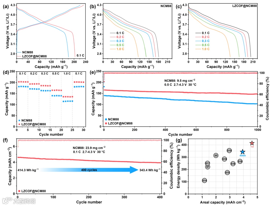 为验证硫化物电解质膜/高比能电极用双界面工程策略的可行性,结合LZCOF@NCM88正极膜、LPSCB电解质膜与锂负极以组装ASSLMBs。LZCOF@NCM88电池(9.5 mg cm−2)在0.1 C下的首圈放电容量为203.6 mAh g−1,库仑效率达87.3%,证实LZCOF涂层能够有效抑制界面副反应。该电池在0.1-1.0 C范围内性能优越,1.0 C时容量为136.1 mAh g−1,倍率回到0.1 C后仍保持202.3 mAhg−1。长循环测试显示电池0.5 C下循环1000次后容量保持率为88.9%,电压极化显著降低。高负载正极(23.9 mg cm−2)条件下电池首圈放电面容量达4.62 mAh cm−2,400次循环后保持85.3%,电池能量密度从414.3降至343.4 Wh kg−1。与相关文献相比,LZCOF@NCM88电池的面容量和能量密度均处于领先水平。