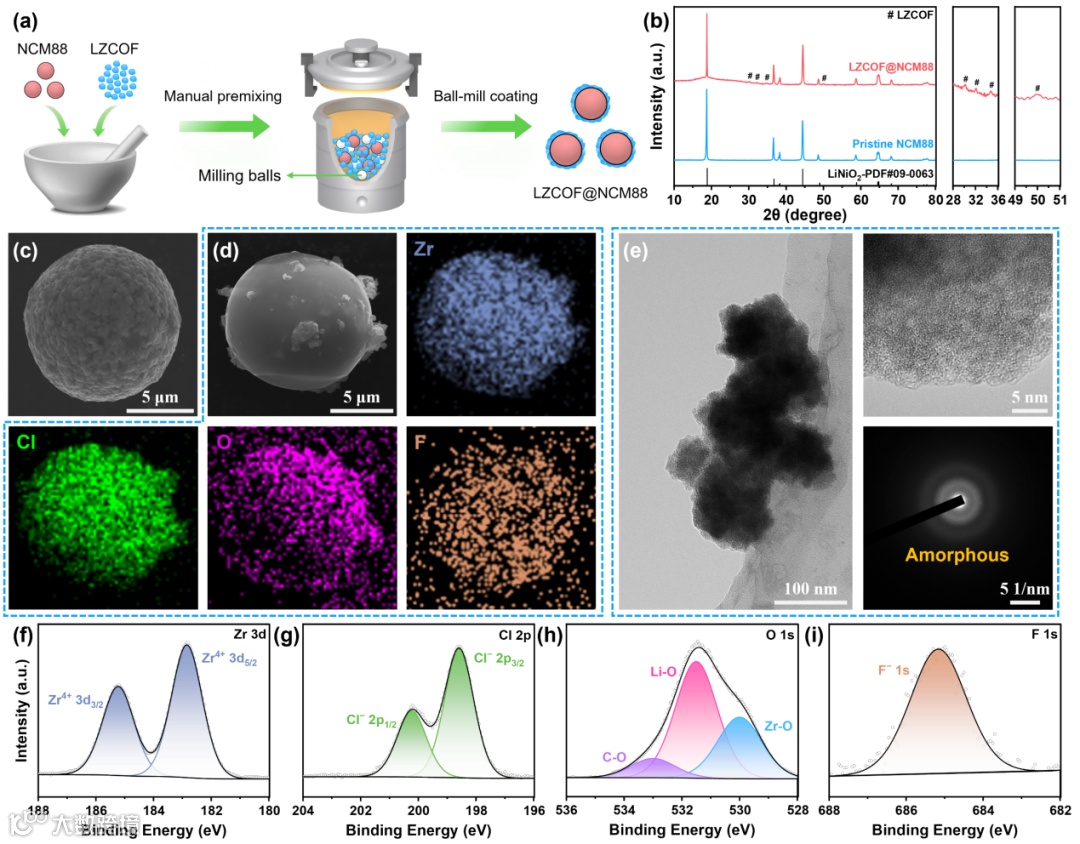 图4. LZCOF包覆NCM88正极粉末结构表征