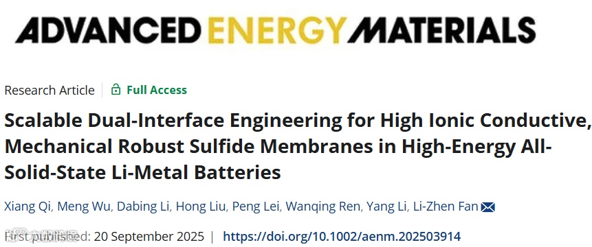 Xiang Qi, Meng Wu, Dabing Li, Hong Liu, Peng Lei, Wanqing Ren, Yang Li, Li-Zhen Fan*. Scalable Dual-Interface Engineering for High Ionic Conductive, Mechanical Robust Sulfide Membranes in High-Energy All-Solid-State Li-Metal Batteries, Adv. Energy Mater. 2025, 202503914,