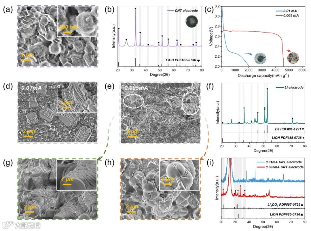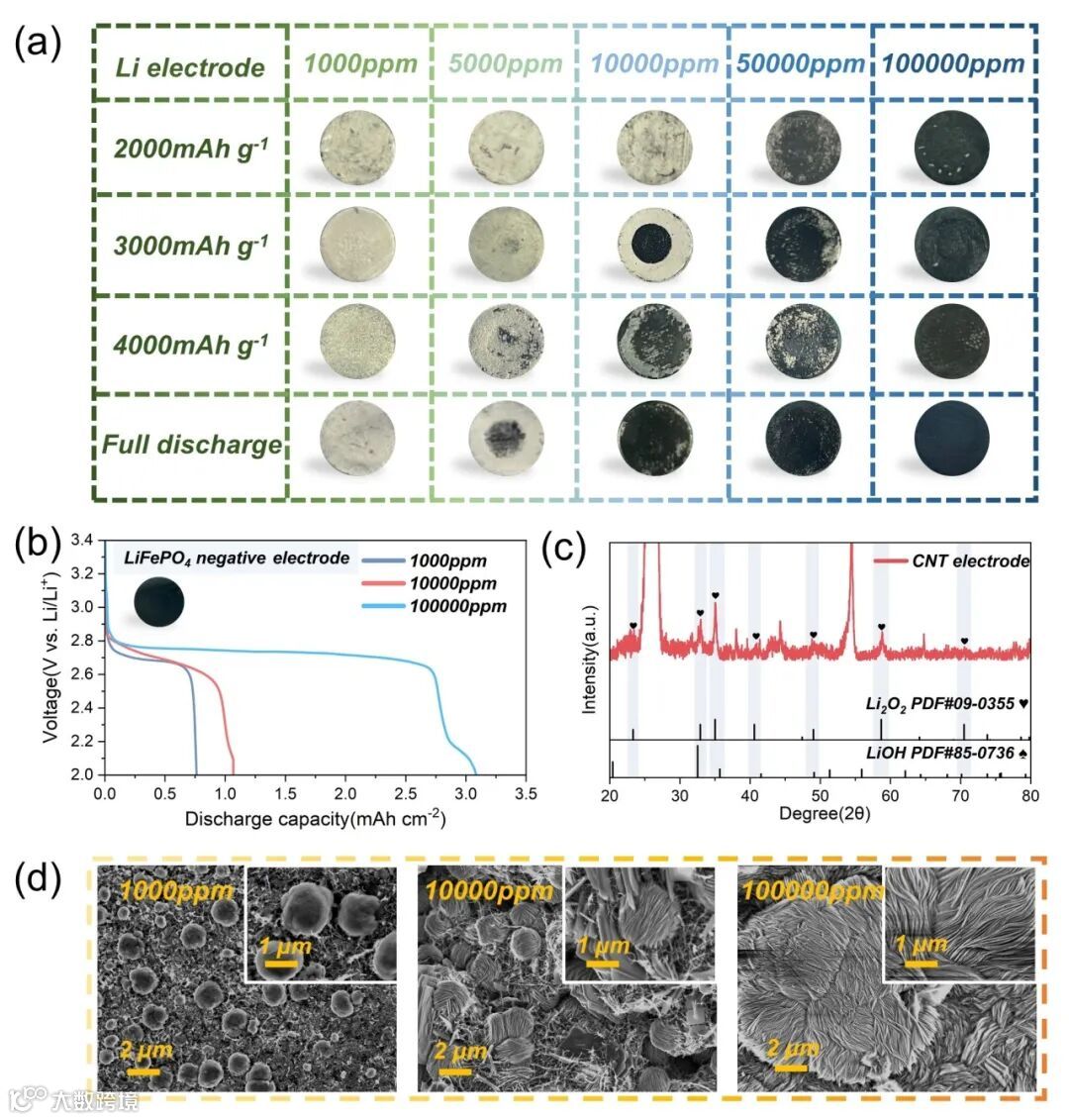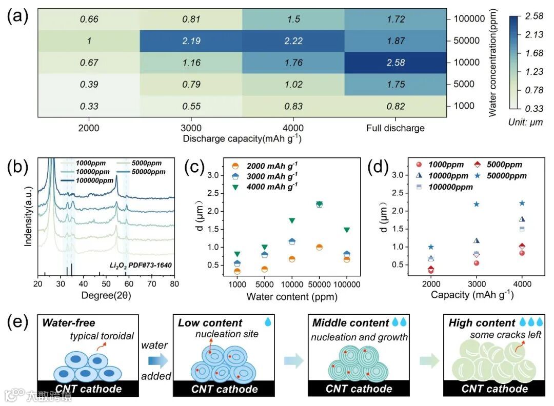 无水体系产物呈细小颗粒状,均匀覆盖正极表面;在1000 ppm水下,出现具有凹陷中心的环状结构(图4b),表明水促进了界面成核与溶解-再沉积协同反应;当水浓度升至10000 ppm时,Li2O2呈片层叠加状,在沟槽部位二次成核并沿电子导通路径生长,极大地扩展了反应活性面积,解释了放电容量的大幅提升(图4c)。然而在50 000 ppm以上时,产物逐渐转变为致密球形并相互堆积(图4d),导致孔道堵塞与极化上升。XRD结果(图4e-f)显示,各体系主要放电产物均为Li2O2,但高水体系中伴随少量LiOH副产物生成,验证了电化学与化学反应的耦合转变。
