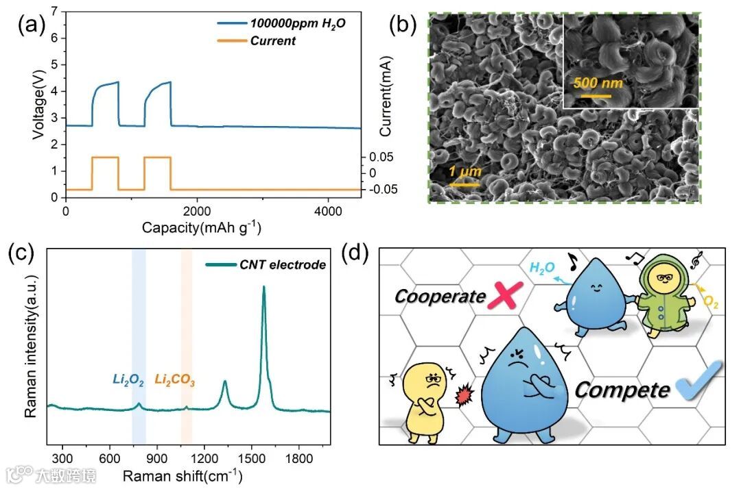 通过间歇式放电-静置测试发现,放电初期产物主要受水主导。当体系中水逐渐耗尽后,产物形貌恢复为典型的环状结构(图7b-c)。这表明水较氧具有更高的反应优先性。Raman光谱(图7d-e)检测到含水体系产物中存在Li2CO3信号,归因于水促进电解液的部分降解。基于以上实验结果,提出水和氧在反应中存在竞争关系(图7f):初期水主导溶剂化重构并触发Li2O2成核,中期水-氧协同促进产物生长,后期氧主导晶体完善生长。该过程完整刻画了水从钝化因子向电化学参与者的转变路径。