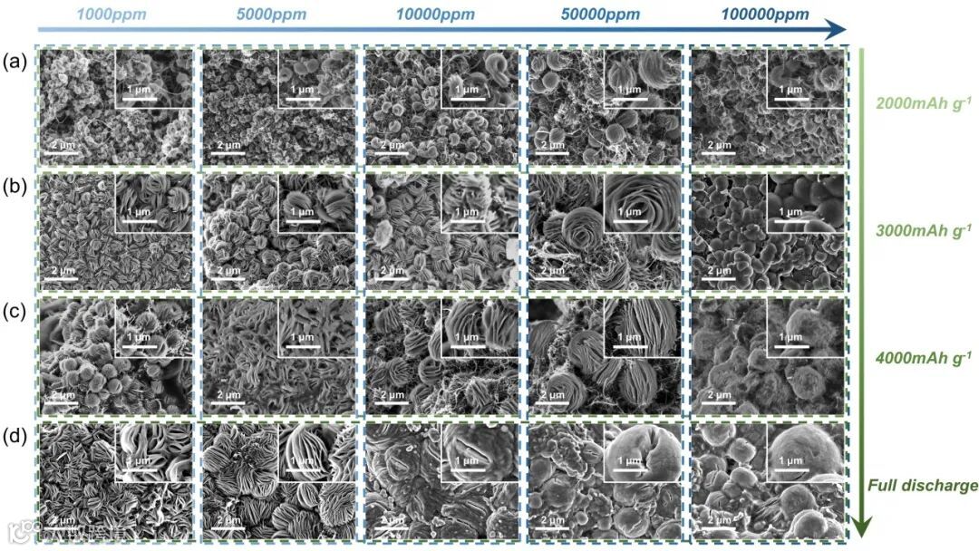 图4. 放电产物Li2O2在不同水含量下的形貌演化