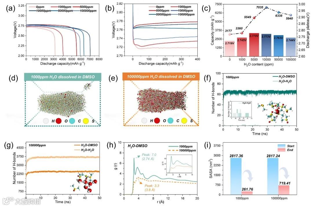 图1.水诱导的溶剂化结构重构主导了Li–O2电池的电化学反应行为