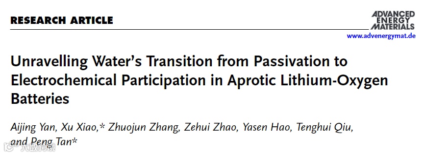 题目:Unravelling water's transition from passivation to electrochemical participation in aprotic lithium-oxygen batteries期刊:Advanced Energy Materials作者:Aijing Yan, Xu Xiao*, Zhuojun Zhang, Zehui Zhao, Yasen Hao, Tenghui Qiu, Peng Tan*