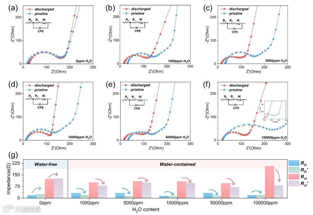 无水体系放电前后阻抗几乎不变,表明电荷转移受限;而在1000–10000 ppm水浓度下,放电后半圆半径明显缩小,界面电阻由约210 Ω降至95 Ω,显示水显著改善电极润湿性并促进界面极化缓解。当水浓度超过50 000 ppm时,EIS曲线再次出现大半圆,说明副反应生成的绝缘产物(LiOH/Li2CO3)覆盖正极表面。对等效电路拟合结果表明(图2d-f),水的引入改变了界面双电层结构并增强了离子迁移速率;然而当其超出溶剂化饱和度后,离子通道堵塞,阻抗反而上升。这一结果明确指出,水在Li–O2体系中兼具促进与钝化双重角色。
