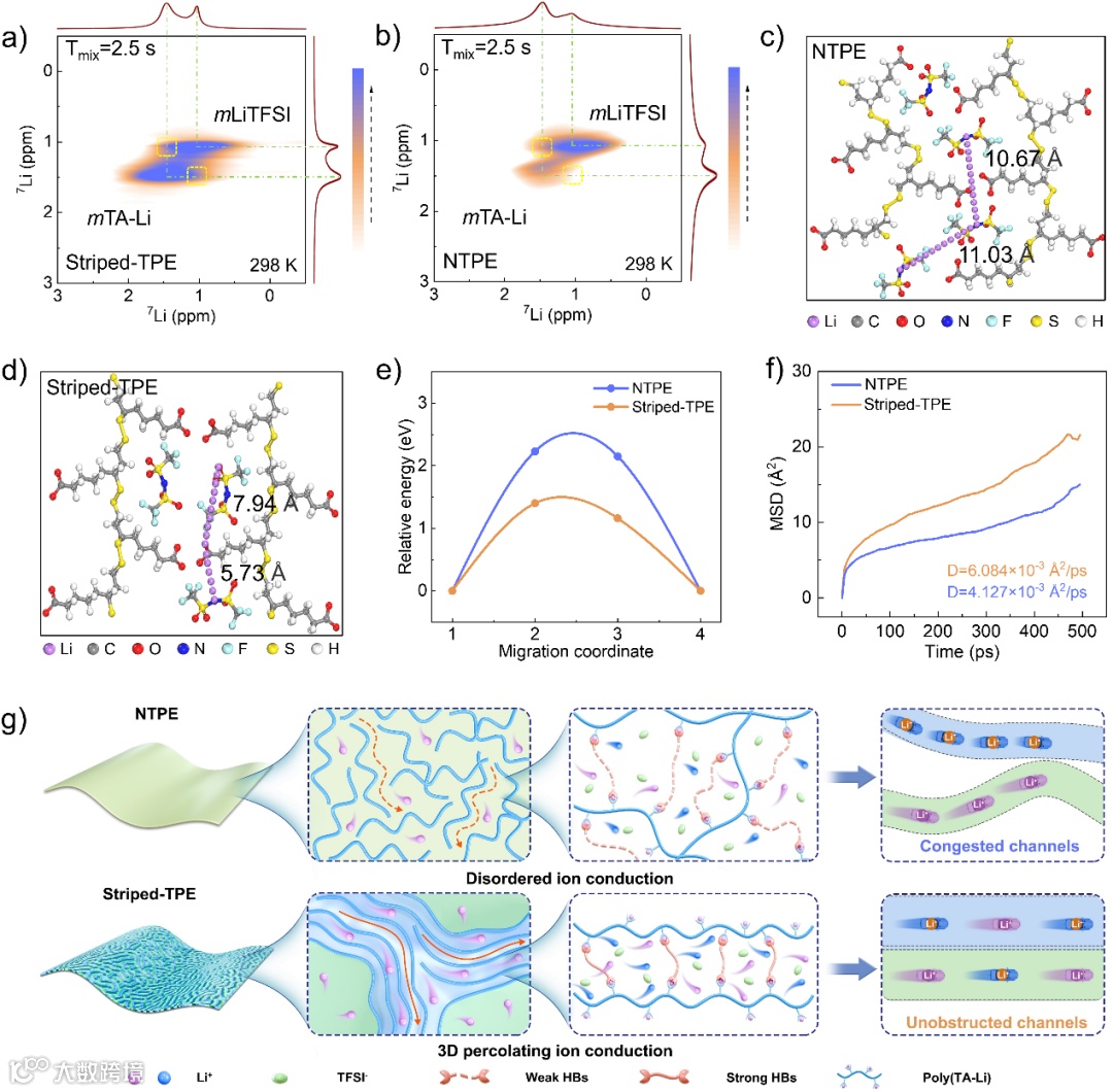 图3a展示了使用7Li-7Li二维交换光谱(2D-EXSY)追踪不同Li+物种的迁移路径。在striped-TPE中,聚(TA-Li)与LiTFSI之间的共振出现明显的非对角线交叉峰,表明Li+交换与迁移显著增强。图灵条纹区域内增强的氢键作用促进了Li+从聚(TA-Li)中解离并加速其传输,形成LiTFSI与聚(TA-Li)之间的有效传输路径,显著提高了Li+迁移效率。相比之下,NTPE中氢键作用较弱,聚(TA-Li)中的Li+解离受限,Li+主要沿LiTFSI传输,导致迁移效率显著降低(图3b)。分子动力学(MD)模拟进一步验证了这一发现,striped-TPE中Li+的迁移路径显著短于NTPE(图2c,d)。较低的迁移能垒减少了离子迁移阻力,提升了Li+电导率(图2e)。均方位移(MSD)分析表明,striped-TPE通过周期性的离子自富集域减少了Li+的迁移距离,并提供三维连续传输路径,显著提高了离子传输动力学(图2f)。总体而言,条纹区域内的离子富集效应与Li+的协同运动通过三维传输通道持续迁移,显著降低了Li+迁移能垒,提升了离子电导率(图3g)。