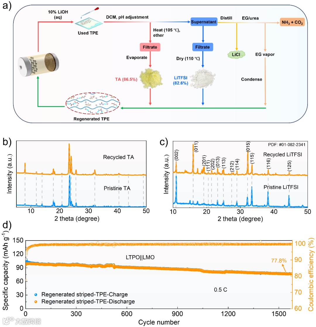 图5a展示了TPE材料的可回收性,TA与锂盐LiTFSI的回收率分别为86.5%和82.6%。图5b和c中的XRD结果表明,回收后的TA和LiTFSI晶体结构与原始样品一致,证明回收过程保持了材料的结构稳定性。图5d展示了使用回收材料再生的striped-TPE组装的LTPO||LMO电池,经过1580次循环后,容量保持率为77.8%,与原始材料的电池性能相当。回收材料的再生能力进一步验证了TPE在可持续设计中的潜力,特别是在降低生产成本、提升环境友好性和提高材料利用效率方面。