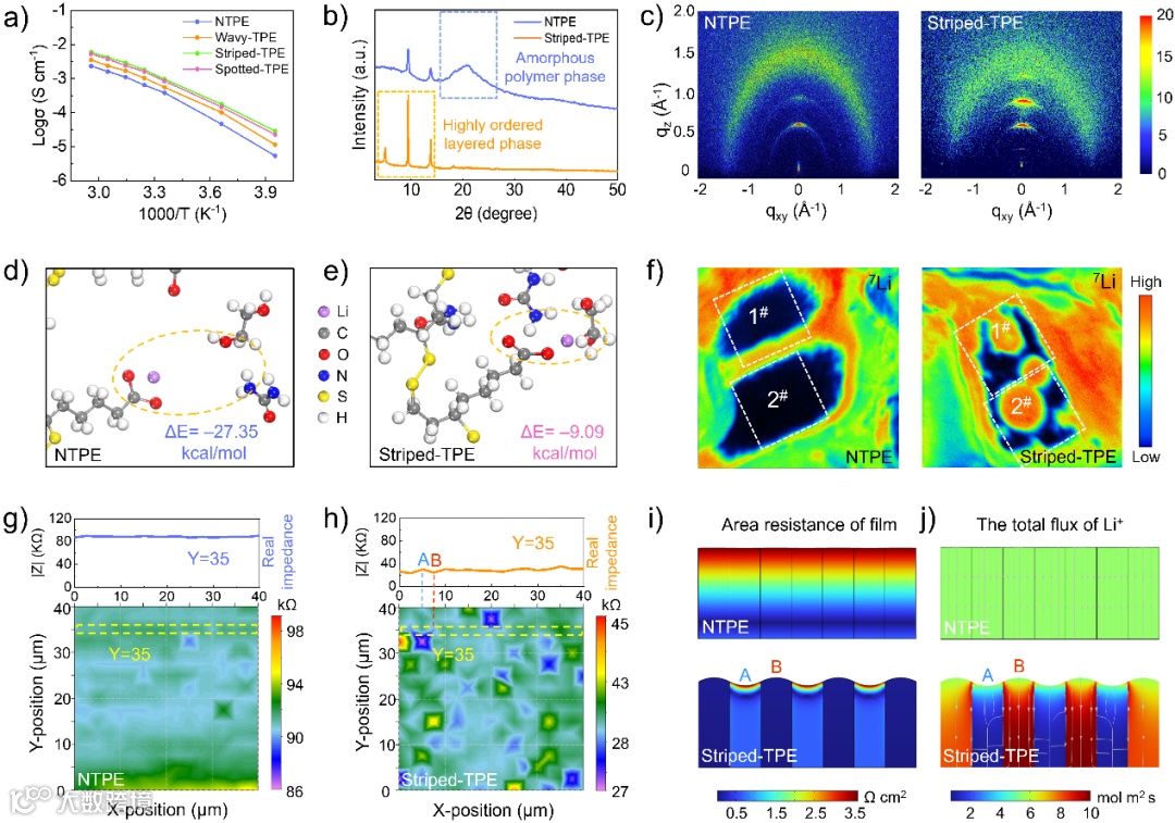 图2a展示了条纹状图灵结构聚合物电解质(striped-TPE)的电导率(1.6 × 10–3 S cm–1),显著高于非图灵结构聚合物电解质(NTPE, 6.5 × 10–4 S cm–1)。X射线衍射(XRD)和掠入射广角X射线散射(GI-WAXS)分析表明,通过加快溶剂蒸发速率,促进了striped-TPE中分子聚集,增强了局部氢键作用,使聚合物链排列更加有序,从而提升了Li+传输通道的连续性(图2b, c)。进一步的密度泛函理论(DFT)模拟显示,氢键的增强显著降低了聚(TA-Li)中Li+与COO–之间的相互作用,促进了Li+的快速迁移(图2d, e)。纳米二次离子质谱(nano-SIMS)分析表明,striped-TPE的条纹区域内,Li+显著自富集,形成离子富集区(图2f)。此外,间歇接触交流扫描电化学显微镜(ic-ac-SECM)测试表明,striped-TPE表现出周期性的阻抗变化,低阻抗区域与Li+富集区相对应,进一步验证了图灵结构对离子传输的促进作用(图2g, h)。FEM进一步证实,图灵条纹区域(B区)中富集的Li+建立了三维连续传输通道,显著增强了Li+的传输动力学(图2i, j)。