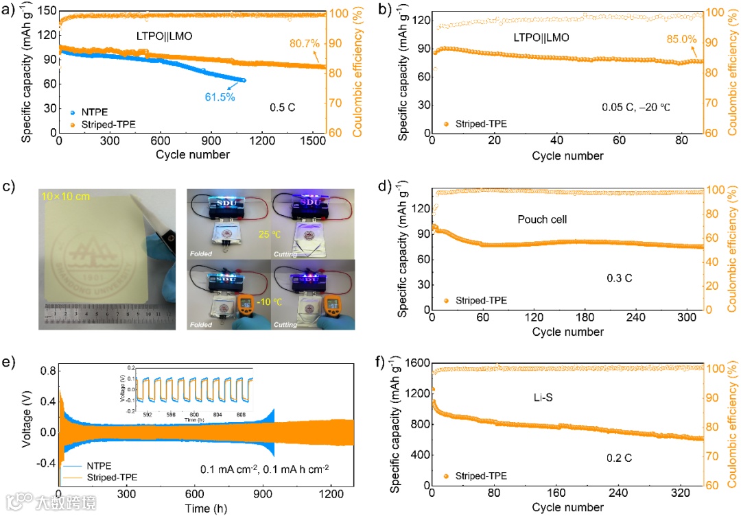 图4a展示了基于striped-TPE的LiTi2(PO4)3||LiMn2O4(LTPO||LMO)电池在0.5 C倍率下的循环稳定性。经过1580次循环后,容量保持率为80.7%,显著优于基于NTPE的电池(容量保持率为61.5%)。即使在–20 °C的低温条件下,基于striped-TPE的电池仍能保持稳定的循环性能(图4b)。图4c展示了大面积striped-TPE膜的制备工艺,验证了其在实际应用中的可行性。利用striped-TPE组装的LTPO||LMO软包电池,即使在弯曲和切割条件下,也能在室温和–10 °C下稳定供电LED灯,并在0.3 C倍率下保持稳定循环(图4d)。此外,图4e展示了基于striped-TPE的Li||Li对称电池在1300小时循环中的稳定性,验证了其与Li金属的良好相容性。图4f展示了基于striped-TPE的Li-S电池,容量高达1258 mA h g–1,并保持350次循环稳定,突显了其在Li-S电池中的应用潜力。