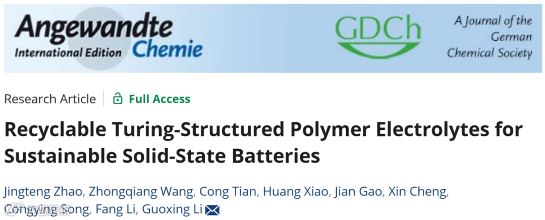 J. Zhao, Z. Wang, C. Tian, H. Xiao, J. Gao, X. Cheng, C. Song, F. Li, G. Li, Recyclable Turing-Structured Polymer Electrolytes for Sustainable Solid-State Batteries. Angew. Chem. Int. Ed. 2025, e19178.