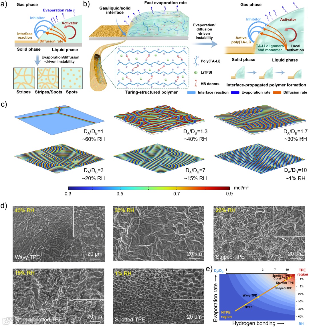 本研究中,活性聚硫辛酸锂(TA-Li)作为抑制剂,调控界面聚合反应的有序性。TA-Li低聚物和单体作为活化剂,通过溶剂蒸发速率与氢键作用的协同效应,在溶液中形成反应物浓度梯度。该梯度在气/液/固三相界面引发蒸发/扩散驱动的反应-扩散不平衡,原位形成周期性图灵结构(图1a, b)。在开放体系中,反应溶液涂覆在基底表面后,溶剂快速蒸发导致液膜边缘蒸发速率高于中心区域,形成浓度梯度,促进反应物向高浓度区域迁移,推动TA-Li中二硫键的交换反应,进而促进聚合物链的自组装与定向生长。随着溶剂蒸发,TA-Li低聚物和单体向反应区扩散,与聚合链结合,形成更长的聚合物链。为进一步增加反应物浓度梯度,引入氢键供体,通过增加溶液粘度促进较大聚集体的形成,减缓TA-Li低聚物和单体的扩散速率,从而加大抑制剂与活化剂之间的反应/扩散速率差异。这种溶剂蒸发速率与氢键作用的协同效应最终促使图灵结构的形成。有限元模拟(FEM)进一步证明,加快溶剂蒸发速率可诱导多种类型的图灵图案(图1c)。此外,通过调节相对湿度(RH)控制溶剂蒸发速率。扫描电镜(SEM)图像显示,随着RH降低,结构从非图灵型过渡到不同形貌的图灵结构,验证了溶剂蒸发速率、氢键作用与形貌变化之间的关系(图1d, e)。