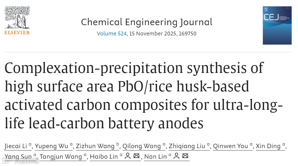 近日,林海波、林楠团队在知名期刊Chemical Engineering Journal上发表了题为“Complexation-precipitation synthesis of high surface area PbO/rice husk-based activated carbon composites for ultra-long-life lead‑carbon battery anodes”论文。该文报道了一种简便、经济、易于规模化的络合沉淀方法,成功制备出纳米氧化铅颗粒牢固锚定于稻壳活性炭(RHAC)的PbO/RHAC复合材料。这种材料既保留了碳材料的高比表面积和导电网络,通过界面化学键(-COO-Pb和-C-O-Pb)有效抑制了析氢反应并且提高了铅沉积的可逆性。研究表明,将PbO/RHAC作为负极添加剂,能构建稳定、多孔的负极结构,显著提升铅炭电池的放电容量、充电接受能力和循环寿命。其中,优化比例的PbO/RHAC-20添加剂,使电池在苛刻的HRPSoC测试中的循环寿命从1098次大幅提升至12102次,增幅超过10倍,展现了巨大的应用潜力。