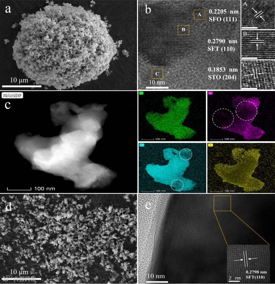 HTS超快速热处理诱导了SFT材料中SrFeO3(SFO)和Sr5Ta4O15(STO)相弥散分布。这种多相共存的结构带来了纳米多晶微结构,极大地提高了材料的比表面积和界面催化活性。DFT计算结果表明,SFO和STO相的存在能降低氧空位迁移势垒,从而增强复合材料的氧离子传输性能。
