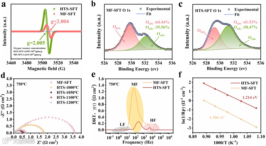 图3 (a) HTS-SFT和MF-SFT的EPR曲线 (b)和(c) O 1S XPS光谱 (d)对称电池的电化学阻抗谱 (e) DRT曲线 (f) Rp倒数的Arrhenius图