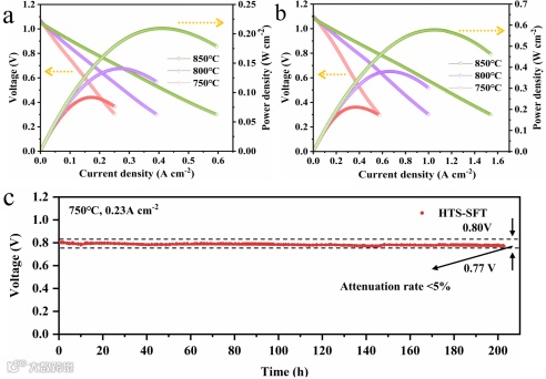 相比于传统烧结的SFT,HTS-SFT单电池的电化学性能得到了大幅增强。在850℃下,HTS-SFT阳极实现了0.578 W cm−2的峰值功率密度,同时,HTS-SFT的极化电阻显著降低,表观活化能从1.306 eV降至1.214 eV,充分证明了其优异的催化活性。此外,由于高键能Ta-O键的存在HTS-SFT表现出优异的稳定性。