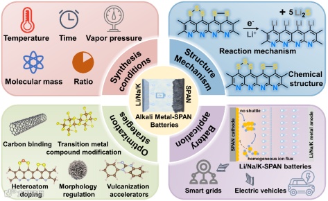 全球能源转型加速与电子设备、电动汽车的普及,对储能技术提出了高能量密度、低成本、环保可持续的迫切需求。传统锂离子电池虽已广泛应用,但正极依赖的过渡金属资源稀缺且价格波动,其能量密度也难以满足下一代储能系统的性能要求,推动研究者转向新型电池体系的探索。金属硫基电池具备超高理论能量密度,以及硫资源储量丰富、成本低廉、环境友好的优势,成为最具潜力的下一代高能储能技术之一。然而,单质硫正极存在致命缺陷:硫本征电导性低,且电化学反应过程中会生成可溶性多硫化物引发穿梭效应,导致电池容量快速衰减、循环寿命缩短,严重阻碍了实用化进程。为解决上述瓶颈,硫化聚丙烯腈(SPAN)凭借独特的结构与性能优势脱颖而出。其有机骨架通过共价键结合硫的形式,能有效抑制多硫化物溶解穿梭,同时缓解体积膨胀问题,成为下一代高比能电池的理想候选材料。但现有SPAN 材料仍面临重大科学挑战:硫含量低于50%,限制了电池能量密度的提升;电化学反应动力学缓慢,影响倍率性能与硫利用率。因此,针对SPAN 材料硫含量低、反应动力学迟缓等关键痛点,开发新型结构设计与改性策略,突破其在实用化工况下的性能瓶颈。