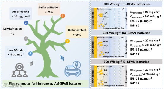 SPAN独特的共价硫键和与各种电解质的兼容性使其能够在锂硫,室温钠硫和钾硫电池系统中部署。评估了高性能硫化聚丙烯腈硫正极在这些电池体系中的电化学性能,强调了在实际条件下能量密度、循环稳定性和可扩展性方面的进步。基于上述评估以及研究现状,提出了未来高比能碱金属-硫化聚丙烯腈电池发展的五个关键参数:硫利用率、硫含量、电极面载量、正负极N/P比、电解液添加量E/S比。对比不同电池体系,总结出未来最佳适配发展电池体系,以及构建了高能量密度电池模型参数,用于推动和指导后续高比能碱金属-硫化聚丙烯腈电池开发。