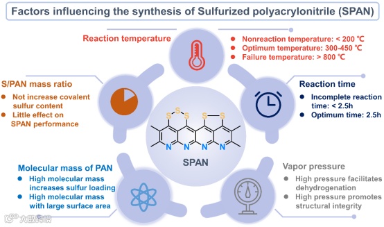 系统化解析了SPAN 的合成受反应温度、时间、蒸气压、聚丙烯腈(PAN)分子量及 S/PAN 比例等因素影响机制。总结出最佳合成条件范围:反应温度以 300-450℃ 为宜,平衡容量、稳定性与结构完整性;最优反应时间为 2.5 h,过长易导致硫挥发,过短则结构不均;适度提高蒸气压可增强PAN与硫的反应效率,改善导电结构;高分子量 PAN 能提升硫负载量与循环稳定性,S/PAN比例建议≤5:1 以避免资源浪费以及环境友好性。通过精准调控这些参数,可实现SPAN 结构与性能的定制化优化,为后续材料改性优化奠定基础。