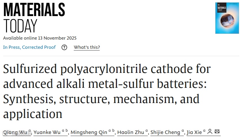 Qiang Wu, Yuanke Wu, Mingsheng Qin, Haolin Zhu, Shijie Cheng, Jia Xie*,Sulfurized polyacrylonitrile cathode for advanced alkali metal-sulfur batteries: Synthesis, structure, mechanism, and application, Materials Today, 2025.