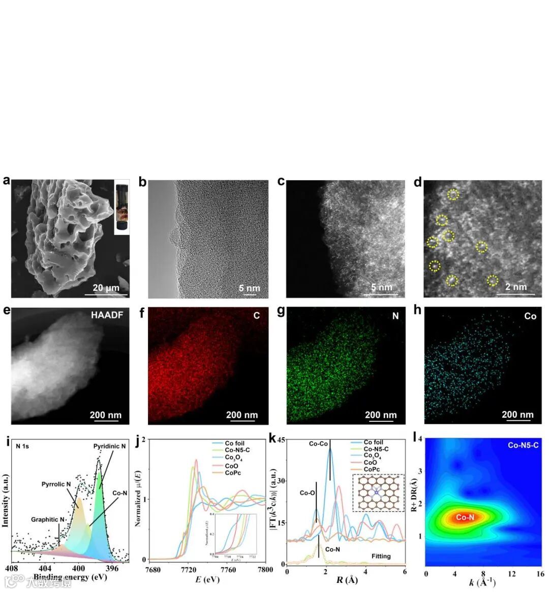 图2. Co-N5-C催化剂的结构分析。a)Co-N5-C的扫描电子显微镜图像,插图为Co-PAN凝胶的实物照片。b. Co-N5-C的高分辨透射电子显微镜图像。c,d)Co-N5-C的像差校正高角度环形暗场扫描透射电子显微镜图像。e-h)Co-N5-C的HAADF-STEM图像及相应元素分布图。i)Co-N5-C的N 1s X射线光电子能谱。j)Co foil、CoO、Co3O4、CoPc和Co-N5-C在Co K边的X射线吸收近边结构谱。k)Co foil、CoO、Co3O4、CoPc和Co-N5-C的Co K边扩展X射线吸收精细结构谱的傅里叶变换,插图示为Co-N5-C的 结构构型。l)Co-N5-C在R空间的小波变换。
