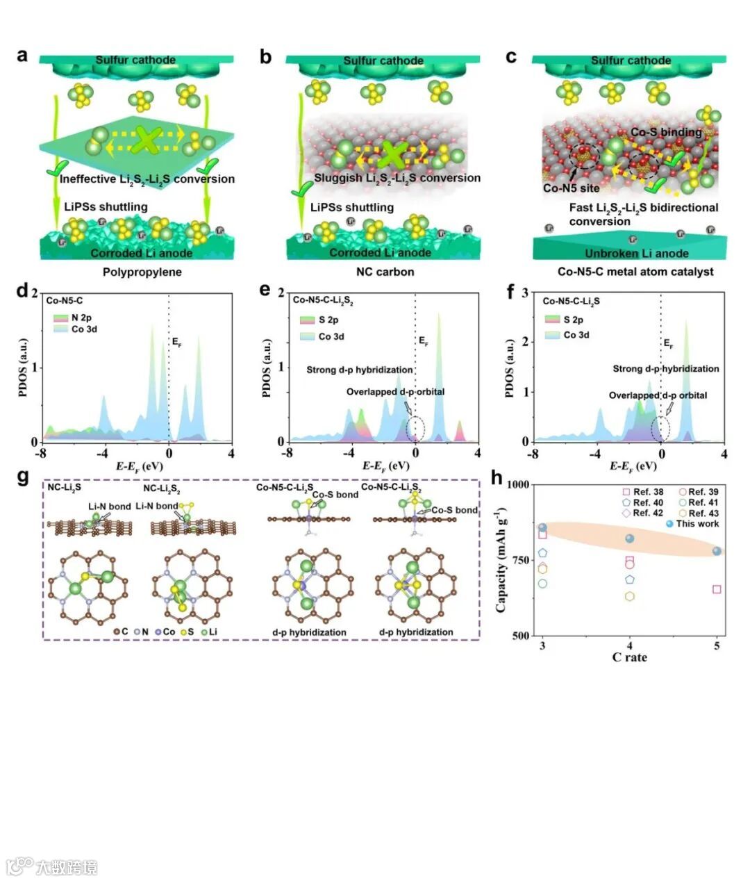 图1. DFT计算的电子结构分析与轨道相互作用研究。a-c) 聚丙烯隔膜、NC碳材料及Co-N5-C催化剂在Li2S2-Li2S双向转化过程中的作用机理示意图。d) Co-N5-C催化剂中Co 3d轨道与N 2p轨道的投影态密度。e)Li2S2中S 2p能带与Co-N5-C中Co 3d能带的电子结构对比。f) Li2S中S 2p能带与Co-N5-C中Co 3d能带的电子结构对比。g) Li2S和Li2S2在NC碳材料与Co-N5-C催化剂表面吸附构型的俯视与侧视优化示意图。h) Co-N5-C改性隔膜与文献报道的单原子催化剂改性隔膜的倍率性能对比。