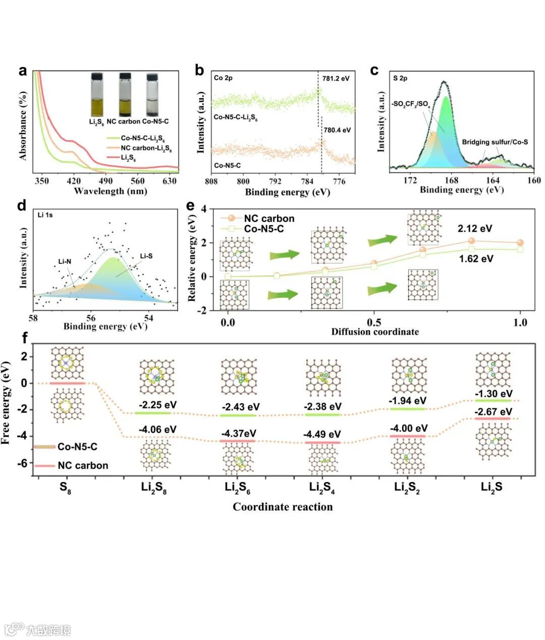 图4. Co-N5-C催化剂中硫物种转化过程的深入探究。a) 0.01 mol·L-1 Li2S₆溶液的紫外-可见吸收光谱,插图为空白Li2S₆溶液、NC碳材料-Li2S₆和Co-N5-C-Li2S₆体系的可视化吸附实验数码照片。b) Co-N5-C材料在Li2S₆吸附前后的Co 2p XPS谱图。c) Co-N5-C吸附Li2S₆后的S 2p XPS谱图。d) Co-N5-C吸附Li2S₆后的Li 1s XPS谱图。e) Li2S在NC碳材料与Co-N5-C表面的解离能垒。f) 硫物种在NC碳材料与Co-N5-C表面还原过程的吉布斯自由能对比。