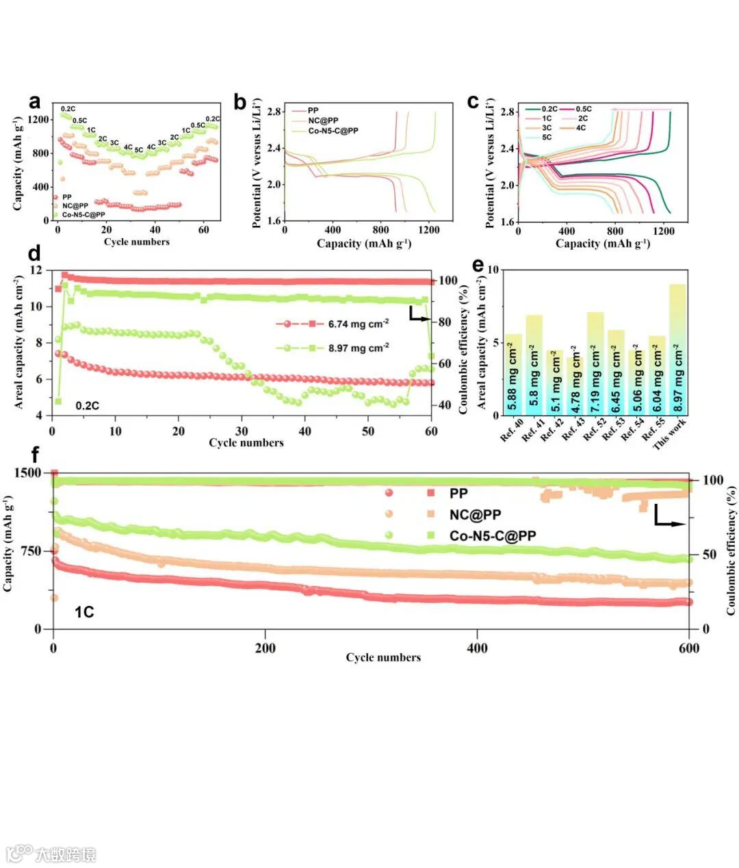 利用Co-N5-C@PP隔膜组装的锂硫电池比PP和NC@PP电池展现出更优异的电化学性能。在5C的电流密度下,放电容量达到780 mAh g-1。并且在8.97 mg cm-2的高硫负载下,面积容量达到了9.0 mAh cm-2(图5)。