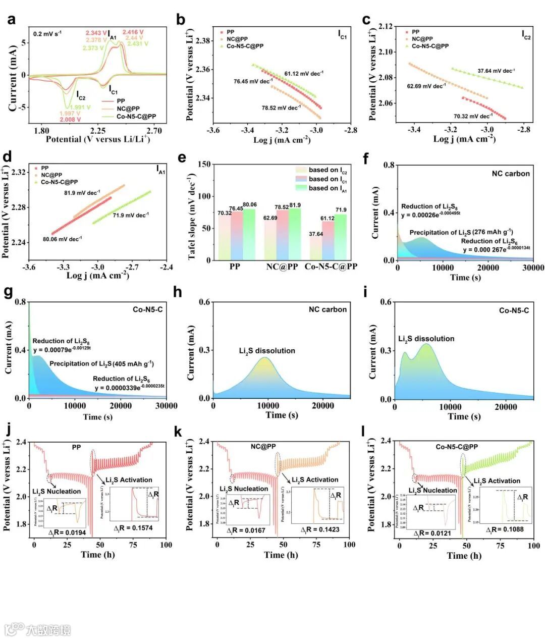 图3. Co-N5-C催化剂的电化学性能表征。a) 使用PP隔膜、NC@PP复合隔膜和Co-N5-C@PP复合隔膜的电池循环伏安曲线;b-e) 对应电池体系的塔菲尔曲线及其拟合数值. f,g) 0.25 MLi2S8溶液在NC碳材料与Co-N5-C电极表面在2.08 V的恒电位充电曲线. h,i) 0.25 MLi2S8溶液在NC碳材料与Co-N5-C电极表面在2.35 V的恒电位充电曲线;j-l) 分别为PP隔膜、NC@PP复合隔膜和Co-N5-C@PP复合隔膜电池的GITT曲线。