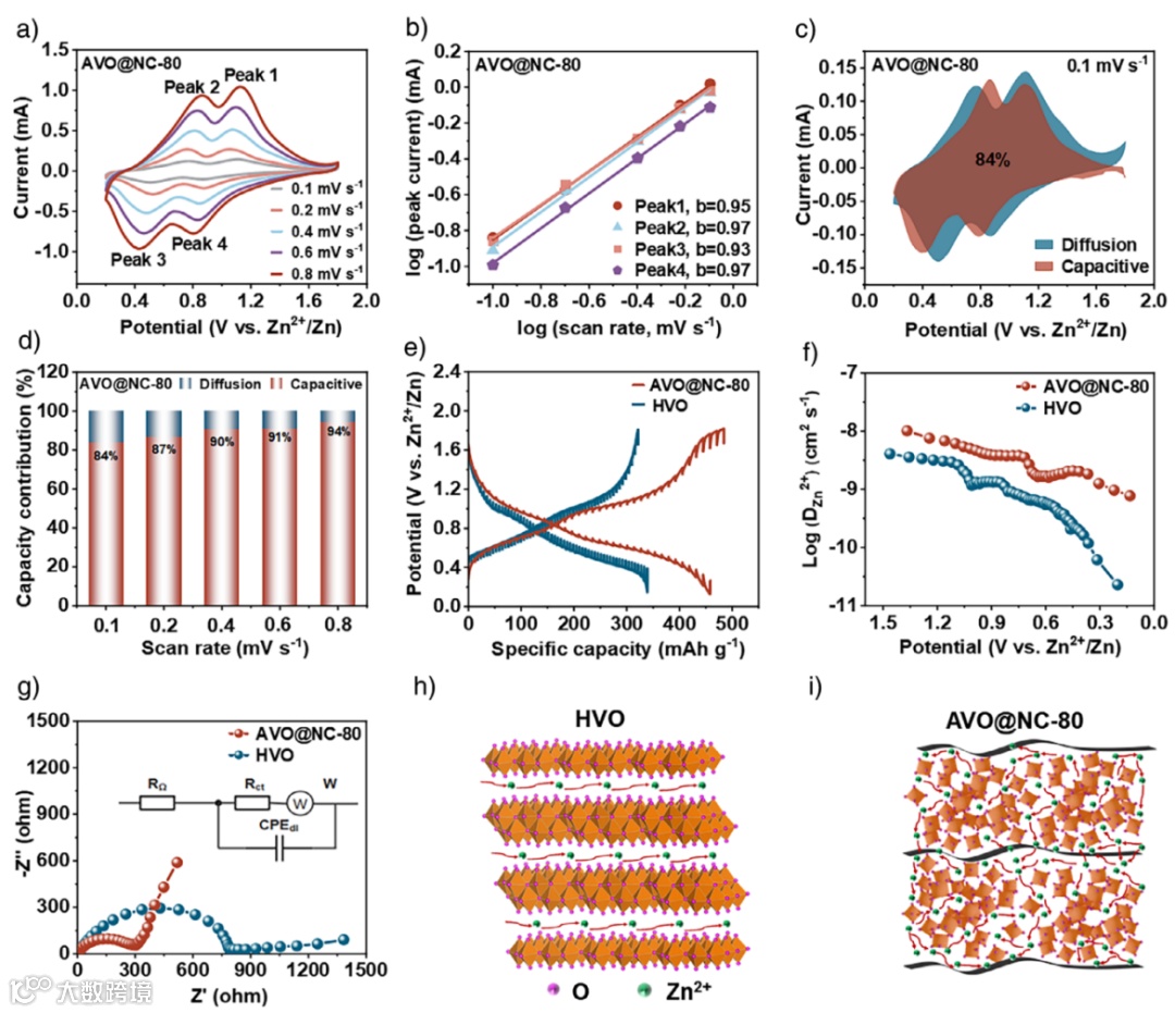 图5. a) Zn/AVO@NC-80在不同扫速下的CV曲线。b) (a)中logi与logv的关系曲线。c) 0.1 mV s−1扫速下扩散和电容贡献的CV曲线。d) 不同扫描速率下的容量贡献图。e)在0.05 A g−1下充放电的GITT曲线图。f) Zn2+在HVO和AVO@NC正极中的扩散系数。g) 开路电位下的电化学阻抗图。h-i) Zn2+在HVO和AVO@NC-80中的扩散示意图。