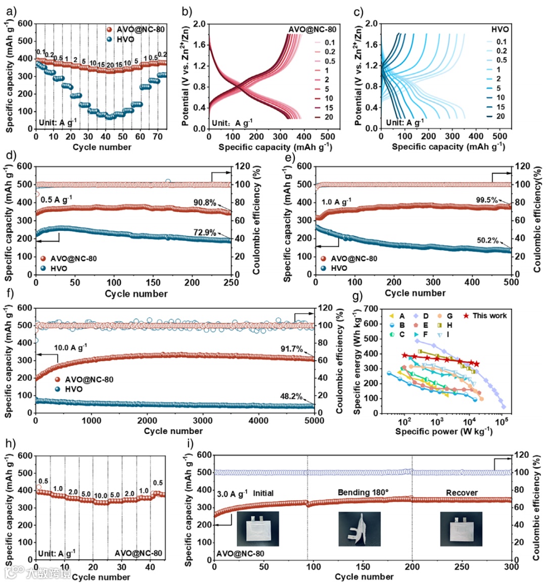 图4. a) AVO@NC-80和HVO在不同电流密度下的倍率性能。 b-c) AVO@NC-80和HVO在不同电流密度下的充放电曲线。d-f) AVO@NC-80和HVO在0.5 A g–1、1.0 A g–1和10.0 A g–1下的循环性能及相应的库仑效率。g) Zn/AVO@NC-80电池与其他已报道的钒基AZIBs的Ragone图比较。h)和i) Zn/AVO@NC-80软包电池的倍率性能和在3.0 A g–1时的循环性能图。