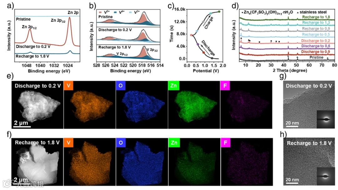 图6. Zn/AVO@NC-80电池的电化学存储机制。a)和b) AVO@NC-80电极在不同荷电状态下的Zn 2p和V 2pXPS谱图:原始状态、放电至0.2 V和再充电至1.8 V。c)和d)在0.1 A g⁻¹电流密度下,首圈AVO@NC-80正极在不同荷电状态下的时间-电位曲线和相应的非原位XRD图谱。e–h) AVO@NC-80电极放电至0.2 V和再充电至1.8 V后的元素分布图和HRTEM图像。