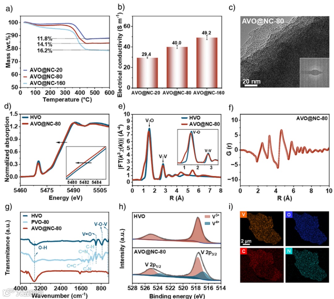 图3. AVO@NC-20、80和160的a) TGA曲线和b) 电导率大小。c) AVO@NC-80的HRTEM图像。d)和e) AVO@NC-80和HVO的V K边XANES和FT-EXAFS光谱。f) AVO@NC-80的PDF分析。g) HVO、PVO-80和AVO@NC-80的FT-IR光谱。h) HVO和AVO@NC-80的V 2p XPS图。i) AVO@NC-80的元素分布图。
