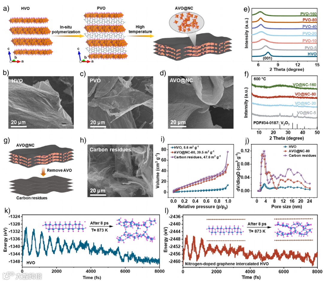 图2. a) AVO@NC制备过程示意图。b-d) HVO、PVO和AVO@NC-80的SEM图。e) PANI嵌入HVO(PVO)的XRD图谱。f) 在600℃保温后PVO的XRD图。g) 去除AVO后的AVO@NC的示意图。h) 残留碳的SEM图。i)和j) HVO、AVO@NC-80和残留碳的氮吸附/脱附等温线曲线和孔径分布曲线。k)和l) 模拟的873K(600℃)下无氮掺杂和有氮掺杂插层的HVO的温度和能量变化曲线。图中插图为初始产物和最终产物的结构模型。