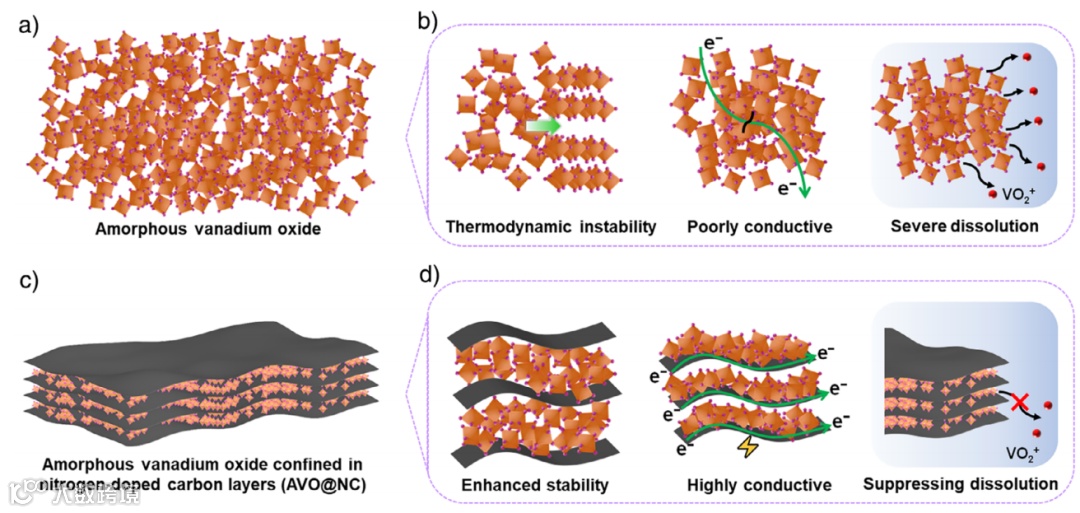 图1. a) AVO的结构示意图;b) AVO作为AZIBs正极存在的问题;c) 氮掺杂碳层中包覆的非晶态钒氧化物(AVO@NC)的结构示意图;d) AVO@NC的结构优势。