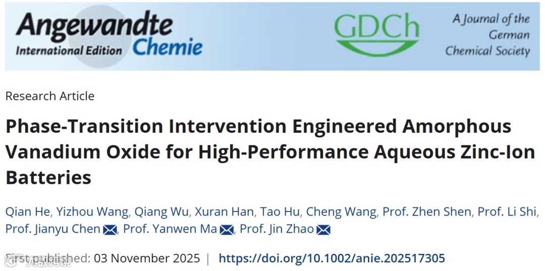 Qian He+, Yizhou Wang+, Qiang Wu, Xuran Han, Tao Hu, Cheng Wang, Zhen Shen, Li Shi, Jianyu Chen,* Yanwen Ma,* and Jin Zhao* Phase-Transition Intervention Engineered Amorphous Vanadium Oxide for High-Performance Aqueous Zinc-Ion Batteries.