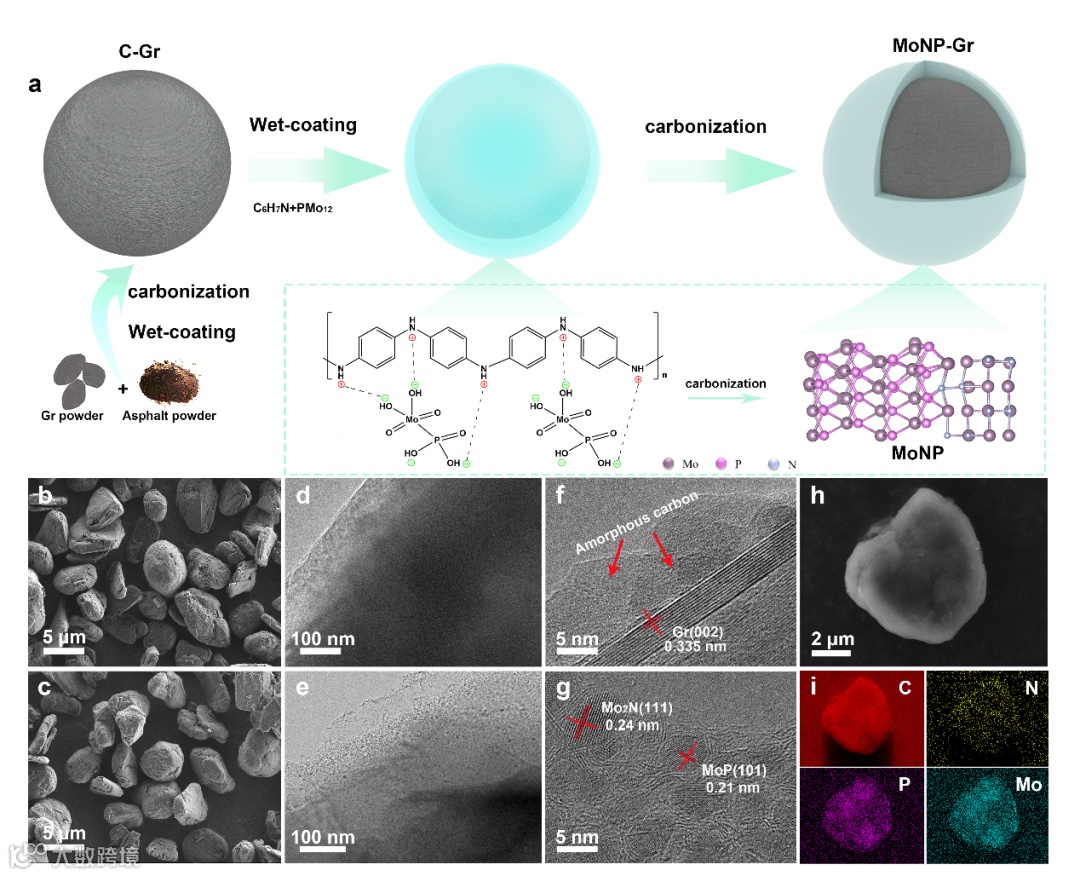 图1 (a) MoNP-Gr 负极的合成流程示意图;(b) C-Gr、(c) MoNP-Gr 的 SEM 图像,以及 (d, f) C-Gr, (e,g) MoNP-Gr的 TEM 图像。(h, i) MoNP-Gr 的 SEM 元素分布图。