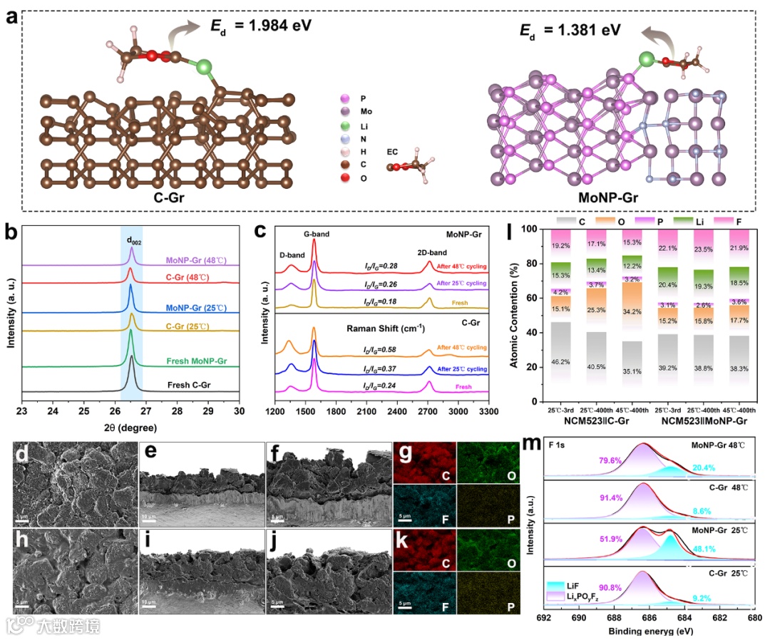 图4 (a) Li⁺–碳酸乙烯酯(EC)溶剂化结构在 C–Gr 和 MoNP–Gr 表面去溶剂化过程的能垒 (Ed);(b) 循环前后的 XRD 光谱;(c) 循环前后的拉曼光谱;(d–f) C-Gr 电极在 25°C、2C 条件下半电池循环 2000 次后的表面和截面 SEM 图像:(d) 表面形貌,(e, f) 截面;(h–j) MoNP-Gr 电极在同条件下的 SEM 图像:(h) 表面形貌,(i, j) 截面;(g, k) C-Gr 与 MoNP-Gr 负极的 SEM 元素分布图;(l) C-Gr 与 MoNP-Gr 负极在不同循环次数后的原子组成比例;(m) C-Gr 与 MoNP-Gr 负极 SEI 膜在不同循环次数后的 XPS F 1s 光谱