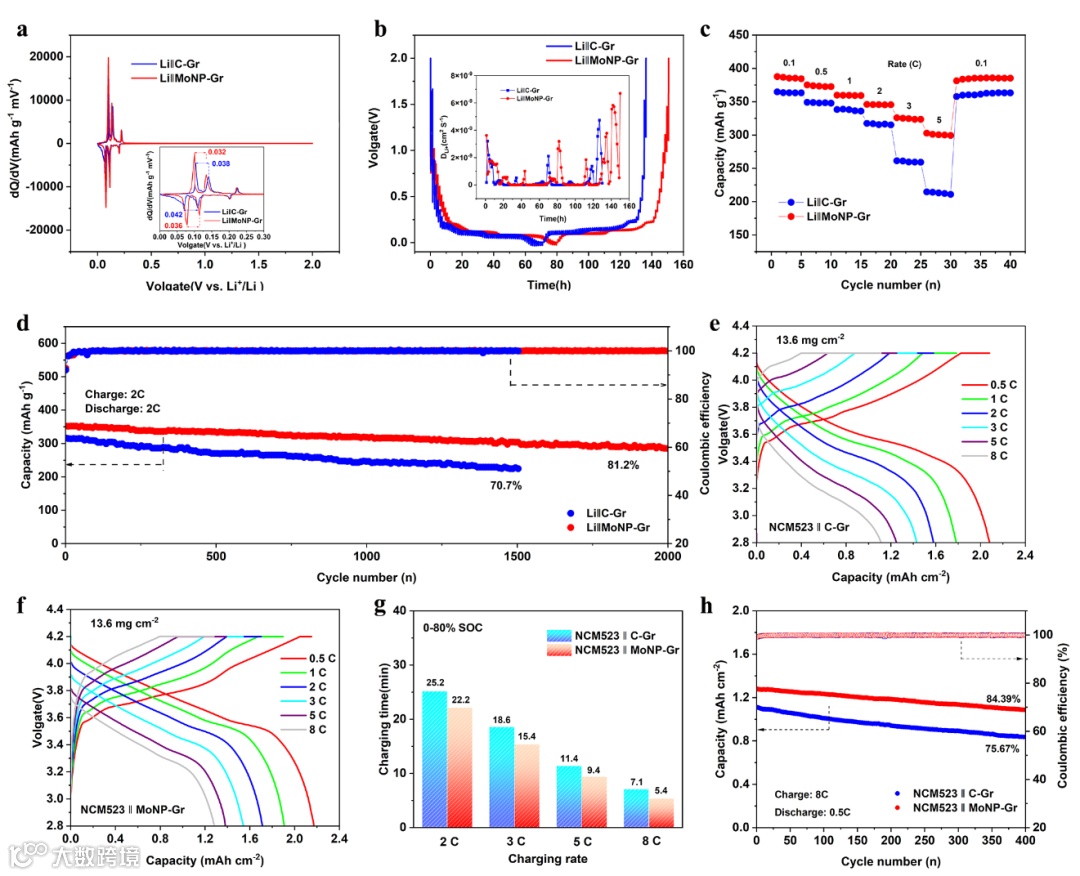 图2 C-Gr 和 MoNP-Gr 负极的电化学性能。(a) 0.1 C 下的 dQ/dV 曲线;(b) GITT 曲线及计算得到的 Li⁺ 扩散系数;(c) 倍率性能;(d) 2 C 条件下的循环性能;(e) NCM523‖C-Gr 全电池的倍率性能;(f) NCM523‖MoNP-Gr 全电池的倍率性能;(g) 全电池从 0 充至 80% SOC 所需的充电时间;(h) 全电池在 8C 充电、0.2C 放电条件下的循环性能及库仑效率。